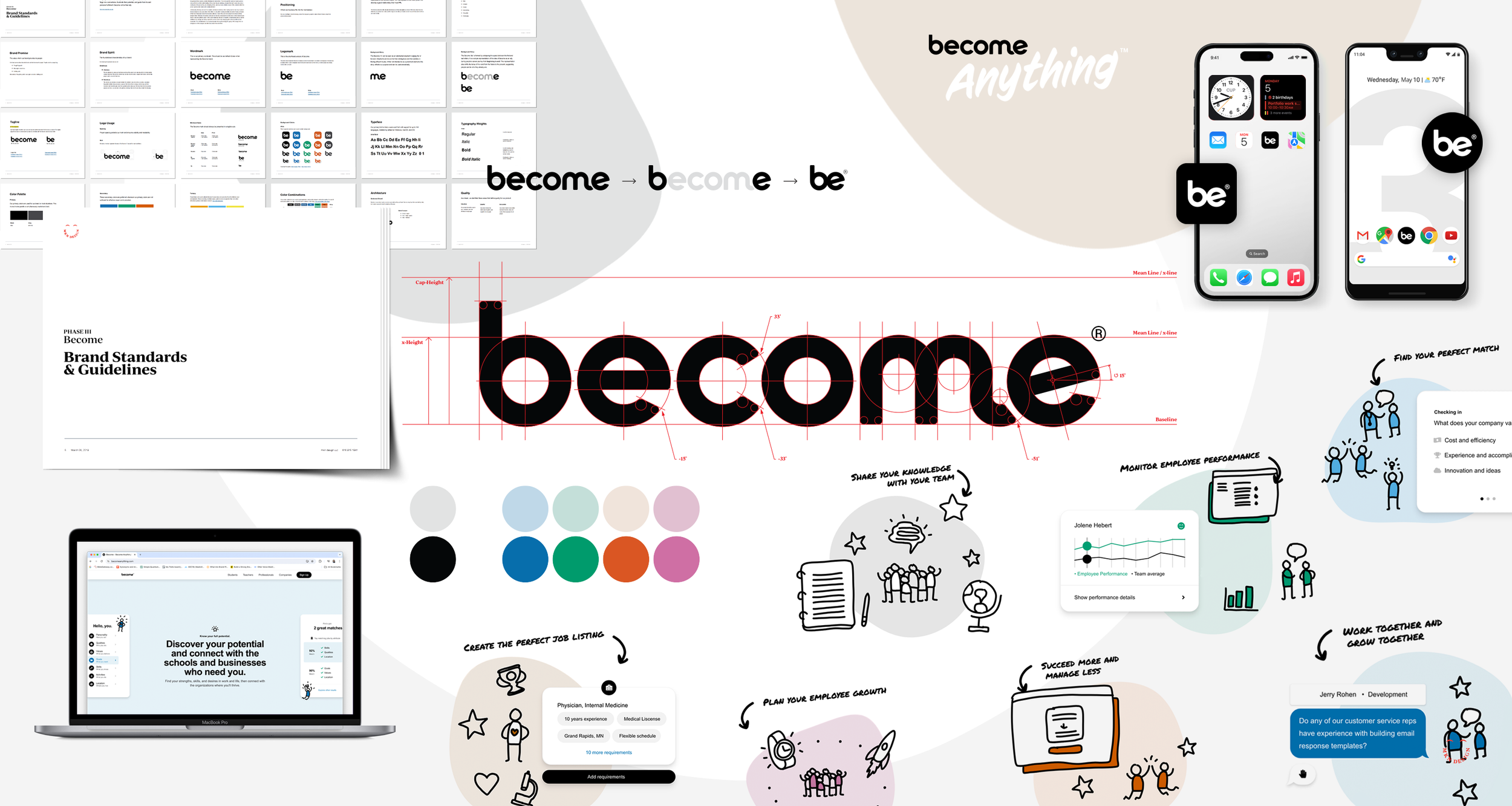 Leading my team through the planning, development, and design of the Become brand identity, I guided a comprehensive process that distilled insights from audience and stakeholder interviews to establish the foundation of the brand. This foundation defined the brand’s tone, voice, and visual direction. As the work progressed, additional research, journey mapping, exploration, brand architecture, and iterative design refined the system into a simple, meaningful, and approachable brand. The process culminated in a comprehensive set of brand guidelines.